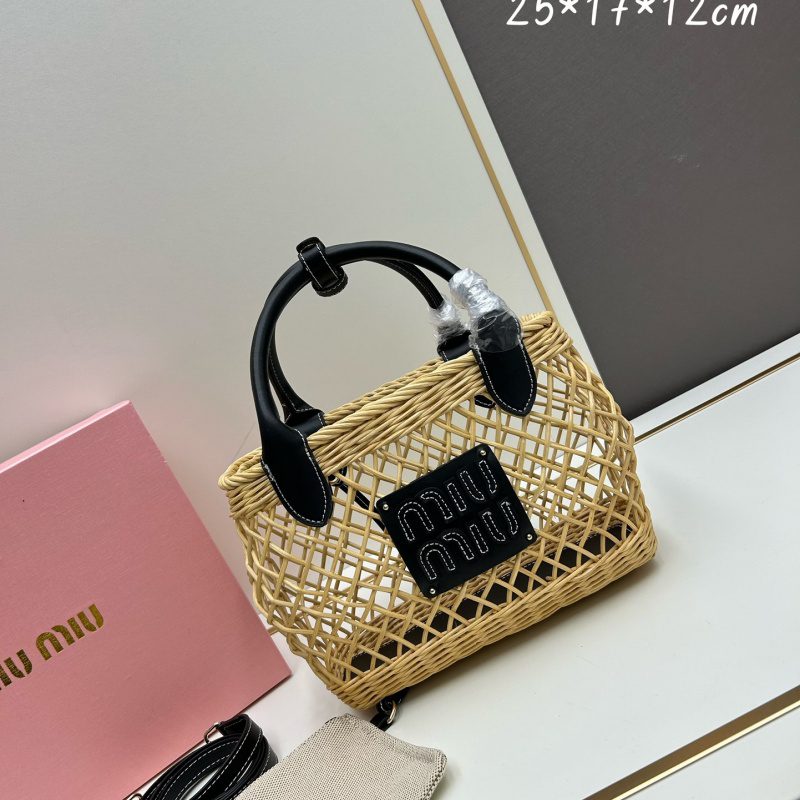 La collezione di Miu Miu borse estive and borse da spiaggia Pensata per le donne. Presenta la mini-bag Miu Miu Jardinière in tela di cotone a righe, la mini-bag Miu Miu in vimini, la piccola borsa all'uncinetto Miu Miu, la mini borsa a secchiello all'uncinetto Miu Miu e la piccola borsa Miu Miu Noué in macramè e camoscio.